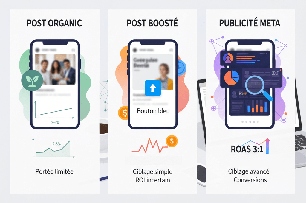 | Caractéristique | Post Organique | Post Boosté | Publicité META (Campagne) |